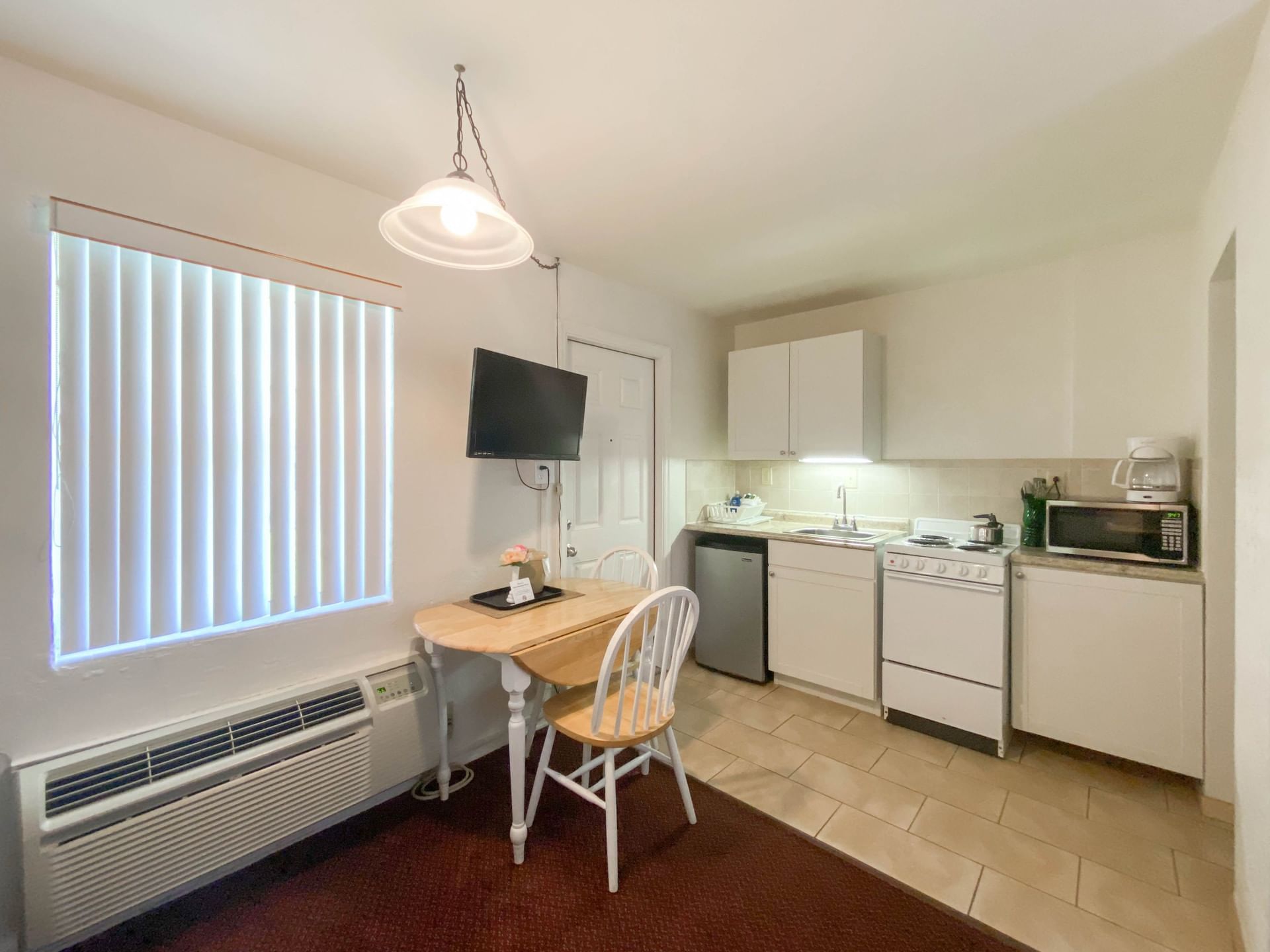 Overlooking our manicured courtyard, our Courtyard Junior Efficiencies provide a small kitchenette with an under-counter refrigerator, stove/oven, microwave, coffee maker, and 2 Full Beds.